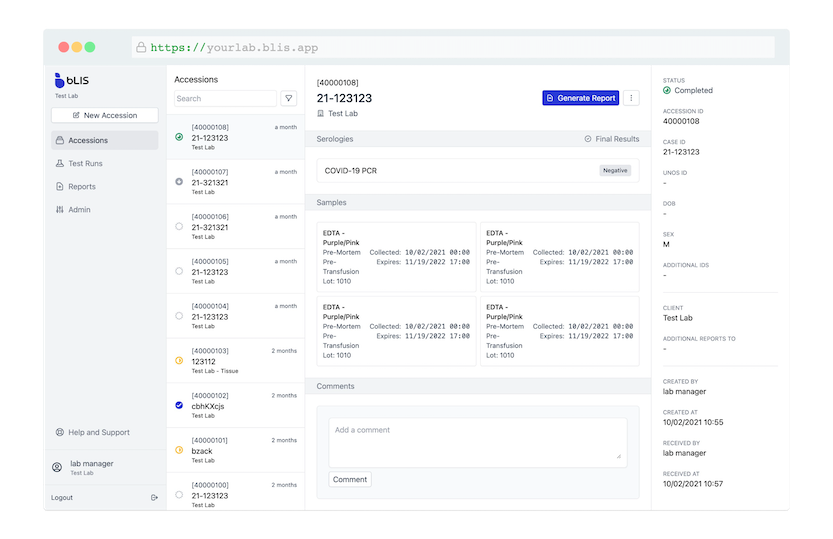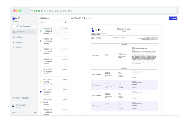 bLIS is audit-ready. It is FDA title 21 part 11 compliant, and all of your data is encrypted to meet HIPAA compliance standards. bLIS is also SOC2 compliant, so you can rest knowing your data is safe and your system is airtight during any audit.